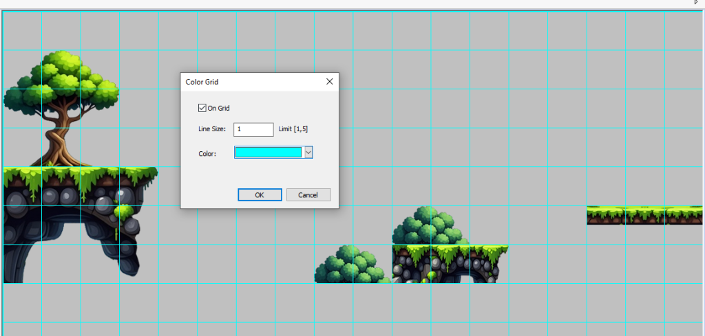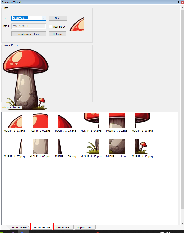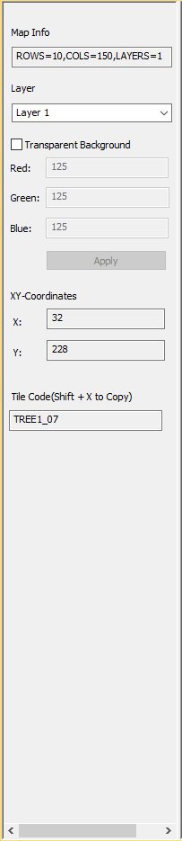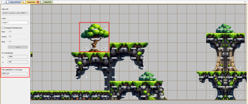 có các chức năng như ô lưới để dễ dàng insert, hiển thị mã tileset, hiển thị vị trí ô trong ma trận tilemap,