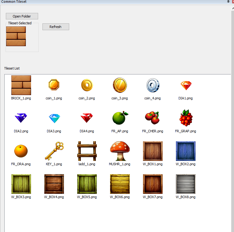 Nhóm các đối tượng game cơ bản như coin, box, diamond, fruits, single tileset